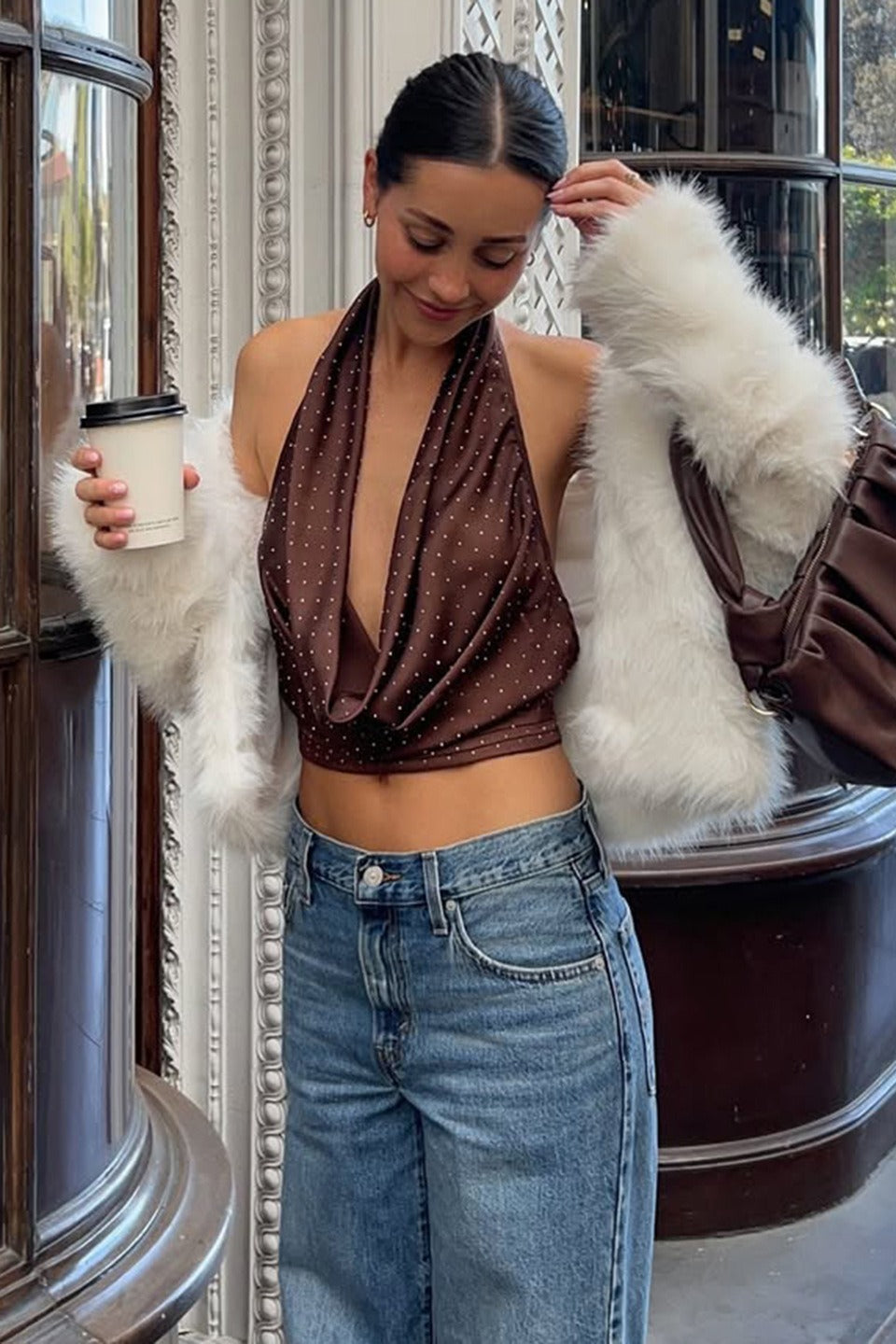 Increase quantity for Polka Dot Color Block Backless Halter Crop Top